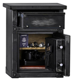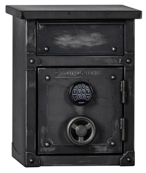 LONGHORN NIGHTSTAND WITH HANDGUN SAFE is an industrial inspired nightstand and a perfect complement to your bedside or sofa. Boasting beautiful craftsmanship and thick steel construction, this clever design allows ample table top space, including a 40 minute of fire protection handgun safe!